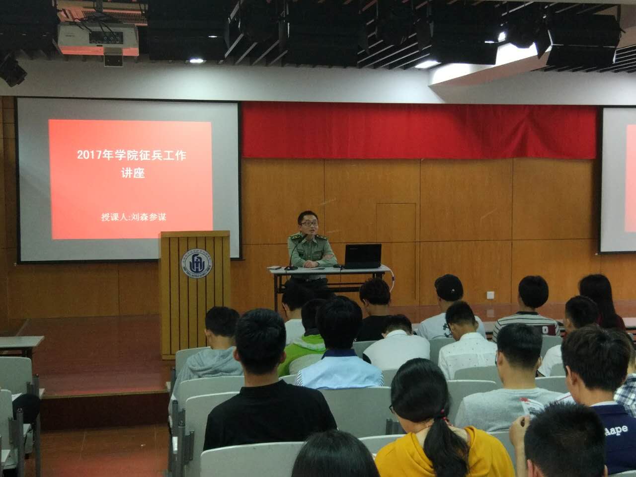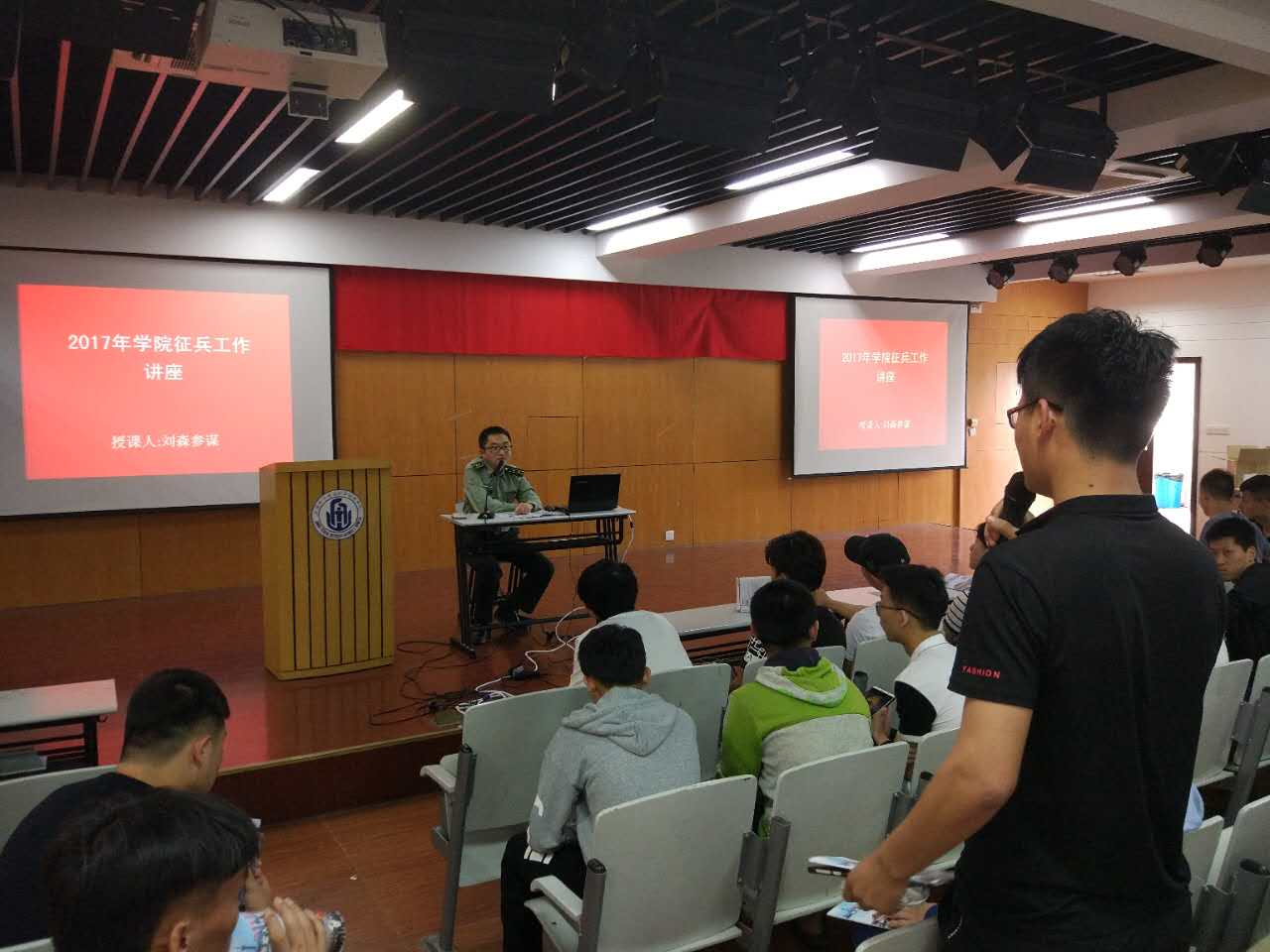 2017年5月24日,学校武装部邀请区武装部刘森参谋莅临我校开展2017年征兵工作讲座。学校各二级学院的辅导员及学生班干部聆听了讲座,刘参谋接合自身的参军经历,对《2017年参军入伍宣传手册》进行了细致的讲解。 最后,师生们与刘参谋进行了现场互动,刘参谋就有关师生们提出的参军问题一一作了详细的解答。