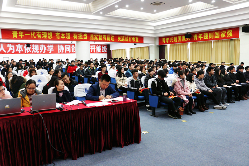 不忘初心,敦品励学,涵养优良学风;牢记使命,明辨笃行,领航青春梦想。在全党全国深入学习贯彻党的十九大精神和习近平新时代中国特色社会主义思想之际,为总结学校一年来的学生工作成果,凝聚人心,激励先进,发挥优秀学生集体及个人的示范引领作用,2017年12月28日,学校在C108报告厅召开2017年度学生表彰大会,学校党委书记田钦,党委副书记、校长杨秀英,副校长窦争妍、徐德明、张涛出席大会。