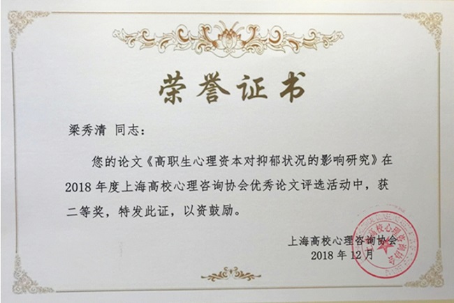 喜讯传来!在上海高校心理咨询协会第26届学术年会中,我校心理健康教育与咨询中心梁秀清的论文《高职生心理资本对抑郁状况的影响研究》荣获优秀论文二等奖。