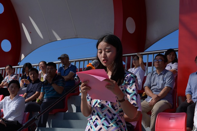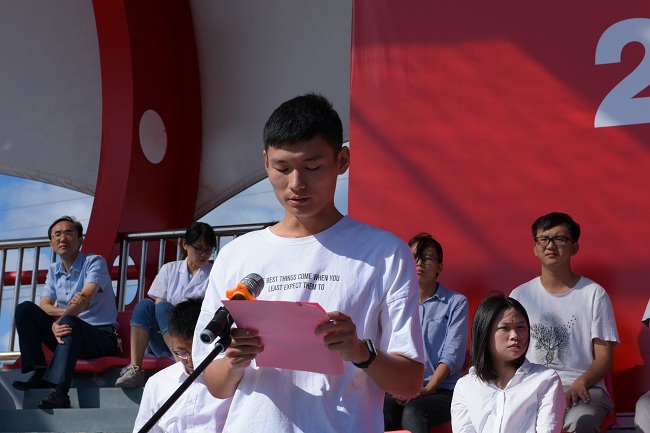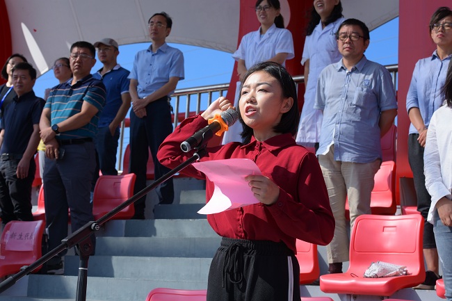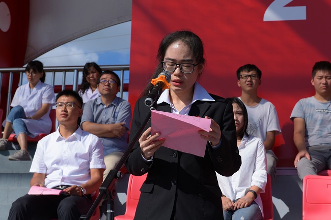 学校国旗班的同学护卫着五星红旗,正步迈向升旗台。随后,开学典礼在庄严的国歌声中拉开序幕。高年级学生代表王婕分享了自己在大学生活中的心得与感悟,号召学弟学妹们拿出“天生我材必有用”的信念,拿出“不到长城非好汉”的毅力,去迎接风雨的洗礼,去探寻知识的海洋。设计与艺术学院2019级新生、退伍军人顾俊杰作为新生代表发言,他表示,作为一名新时代的大学生,要尽快适应新的环境,确立自己的学习、生活目标,在老师的指导下,自主学习,探索创新,大步行走在追梦路上,创造更加辉煌的明天。专任教师代表、经济与管理学院院长冯江华发言。他期望同学们成为思想坚定的红色接班人,用自己的方法锤炼自己,善于创新,勇于挑战,不懈努力,勇于担当。乔旭娟代表新生辅导员发言,她提出,辅导员将为同学们的成长保驾护航,希望同学们抓住机遇,不负韶华,励志勤学,为民族、为国家,勇做引领时代发展的开拓者创新者。