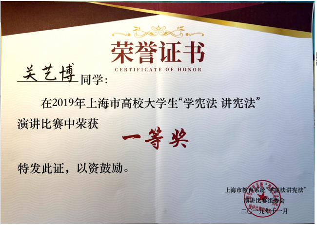 11月24日,由上海市教育委员会主办、华东政法大学承办的第六个国家宪法日暨上海市第三十一届宪法宣传周活动——上海市高校大学生“学宪法 讲宪法”演讲比赛高校组在华东政法大学松江校区明镜楼尚法厅举行。我校选派的选手、经济与管理学院2018级关艺博同学过五关斩六将,在来自31所高校的选手中脱颖而出,荣获一等奖。学校易班发展中心杨洋获优秀指导教师奖。