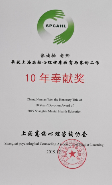 我校张楠楠老师荣获上海高校心理健康教育与咨询工作“10年奉献奖”