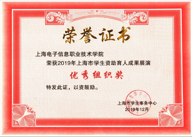 近日,为进一步展现党的十九大以来本市在学生资助育人方面取得的成效,上海市学生事务中心(上海市学生资助管理中心)举办了上海市学生资助育人成果展演,集中诠释2019年学生资助育人成果。我校荣获优秀组织奖。