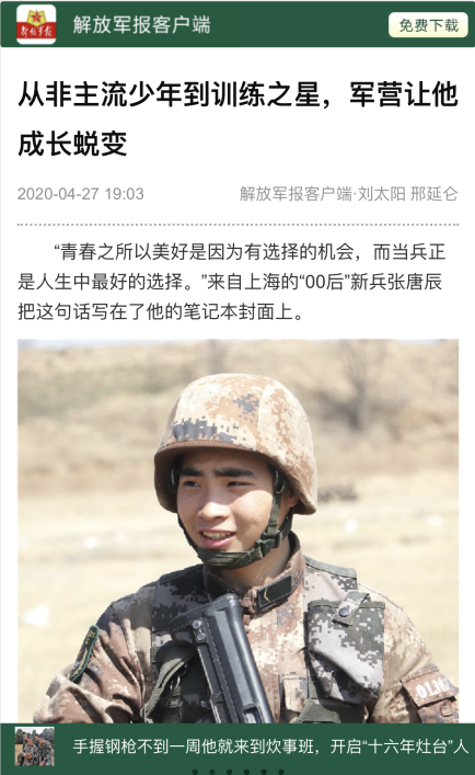 2019年9月,我校电子技术与工程学院15级应电中高职贯通专业学生张唐辰应征入伍,现服役于中国人民解放军第71集团军某部。在新兵集中训练中,不怕苦,不怕累,迎难而上,练就一身“好本领”。 2020年4月27日,中国军网、解放军军报相继以题为“从非主流少年到训练之星,军营让他成长脱变”为题,对我校张唐辰同学进行了报道。 学校一直以来十分关注和重视征兵工作,把该项工作当做政治任务来完成。学校长期跟踪了解在役学生思想、训练、学习及生活动态,探索和完善大学生从在校学习,到应征参军、入伍服役、直至退役复学的全过程育人机制建设,推动学校征兵工作取得新成效。