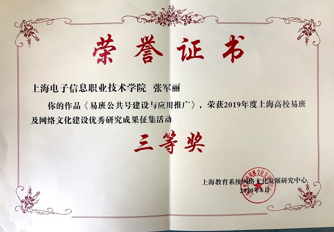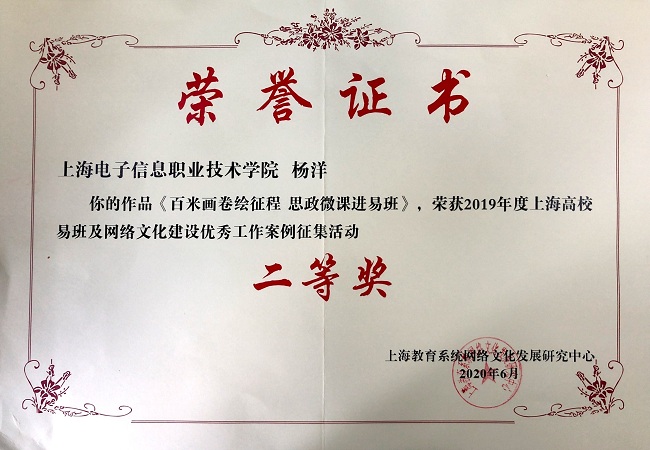 喜报传来!在刚刚结束的2019年上海高校易班及网络文化建设优秀成果征集评选活动中,我校易班发展中心主任杨洋的《百米画卷绘征程  思政微课进易班》荣获优秀工作案例二等奖,电子技术与工程学院党总支副书记、副院长陈真的《高职高专院校易班网上班级建设策略研究》、张军丽《易班公共号建设与应用推广》分获优秀成果二等奖、三等奖。