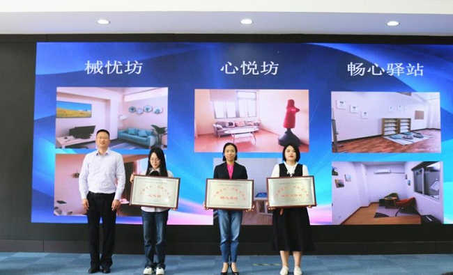 在深化推进“三圈三全十育人”综合改革中,学校注重提升心理育人实效。2018年起,学校开始推动建设二级心理育人工作站,通信与信息工程学院的“心悦坊”、机械与能源工程学院的“械忧坊”、中德工程学院的“畅心易站”参与了第一批次的建设申报。过去两年间,在学校、心理健康教育与咨询中心、二级学院等多方努力下,三家二级心理育人工作站落地生根,其承载的教育、宣传、筛查、实践等功能也日渐成效,顺利通过验收。大会上,学校党委副书记、副校长张涛为“心悦坊”、“械忧坊”、“畅心易站”三家落成的二级心理育人工作站授牌并表示祝贺。