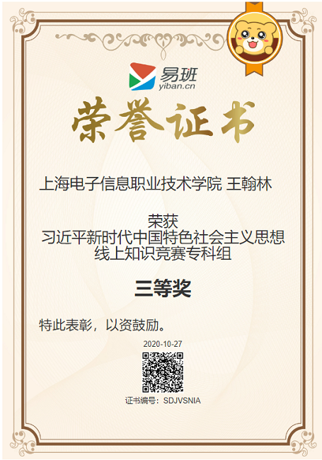 喜报传来!近期,在易班网刚刚结束的“新时代 新思想”——习近平新时代中国特色社会主义思想线上主题活动中,我校荣获习近平新时代中国特色社会主义思想线上知识竞赛优秀组织奖,通信与信息工程学院王翰林同学荣获习近平新时代中国特色社会主义思想线上知识竞赛专科组三等奖。