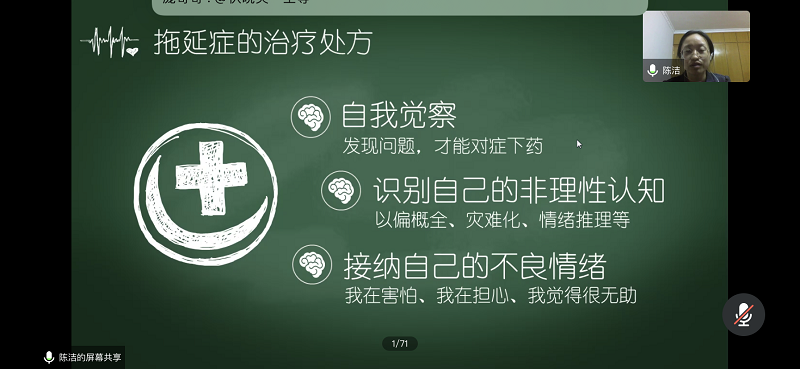 第二讲《拖延症自救指南》主讲教师是上海城建职业学院心理健康教育与咨询中心主任陈洁。拖延症是个让人讨厌又摆脱不掉的家伙,如何成功战“拖”是无数人关注的话题。陈老师指出,战“拖”需要科学方法,一是认清症状,二是清楚成因,三是对症下药开好处方。保持自我觉察,接纳不良情绪,制定可实现的目标,及时奖励自己。