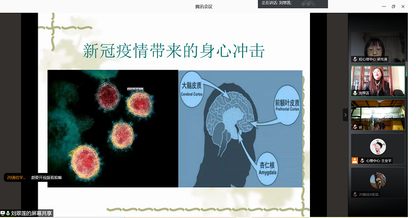 第四讲《大学生的压力管理与心理危机应对》主讲教师是同济大学心理咨询中心副主任刘翠莲。刘老师从新冠肺炎疫情带来的冲击入手,谈压力成因、影响及应对策略,引导同学们识别危机,学做压弹高手。