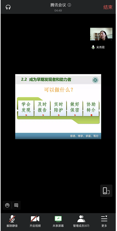 第三讲《心理委员的必备之力——心理危机的早期识别与协同干预》主讲教师是上海师范大学心理咨询与发展中心主任吴燕霞。吴老师从心理危机的表现、诱因、早期识别信号、助力方法等方面手把手教学。心理委员在线反馈说,受教了,涨知识了!