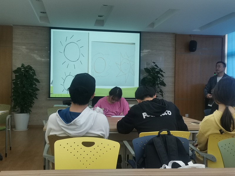活动以游戏的方式开展,寓教于乐。擅长做团体心理辅导的蔡日月老师,首先让同学们自主选择自己喜欢的颜色来代表自己的性格,随后同学们简单的自我介绍,对自己选择卡片的颜色进行分享。接下来,同学们用画笔描绘了心中最美丽的太阳,选出了自己最喜欢的色彩,确定了最爱的岛屿,透过简单的图画了解自己内心的安全感、在团队中的角色定位,和自己向往的生活状态,以及职业方向的定位。