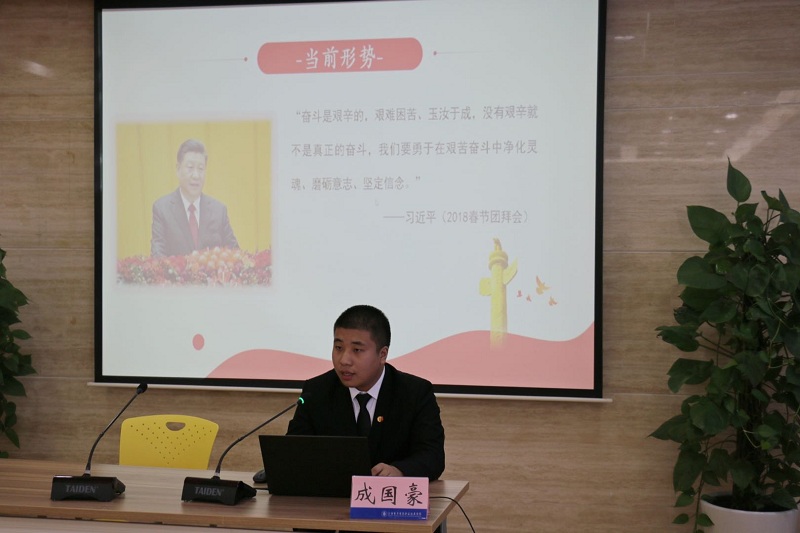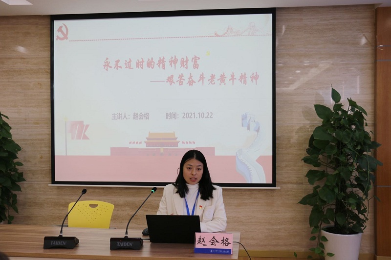 第一组宣讲团由学校关工委副主任盛靖琪、辅导员赵会格、学生成国豪等三人组成。他们以“艰苦奋斗”为中心内容,分别介绍了学校60年来艰苦奋斗的发展历程、中国共产党在不同时期“艰苦奋斗老黄牛”的精神、八路军三五九旅垦荒南泥湾的故事,激励同学们始终保持艰苦奋斗的前进姿态。盛老师说到:“年轻一代要接过艰苦奋斗的接力棒,以一往无前的奋斗姿态和永不懈怠的精神状态,勇挑重担、苦干实干。”