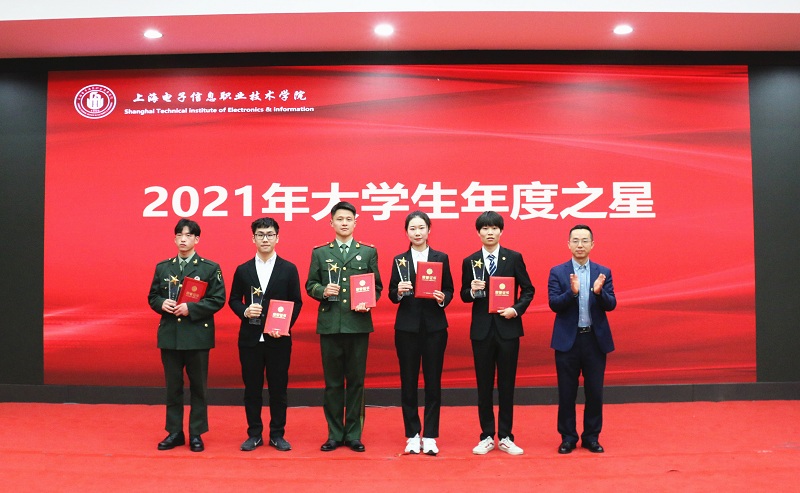 机械与能源工程学院张赛华、电子技术与工程学汪文宇、电子技术与工程学薛金辉、设计与艺术学院“鸿图”团队、中德工程学院“逐梦”团队分别荣获2021年学校“尚德之星”、“笃学之星”、“竞攀之星”、“弘美之星”、“致用之星”。单辰宇、李昕、买买提·吐尔孙、郎金坤、田梦豪获2021年学校大学生年度之星提名奖。赵坚校长为5名年度之星和5位提名奖同学颁发奖状、奖杯。