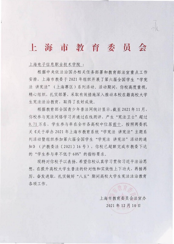 来信指出,根据教育部全国青少年普法网统计显示,截至2021年11月,我校参与宪法网络学习并通过在线测评,产生“宪法卫士”超过0.71万名,学生参与率在全市各高校中位居前十。按照两委机关《关于举办2021年上海市教育系统“学宪法 讲宪法”主题系列活动暨组织参加第六届全国学生“学宪法 讲宪法”活动的通知》(沪教委法[2021]16号),我校超额完成了市教委下达的“学生参与率不低于60%”的指标要求。