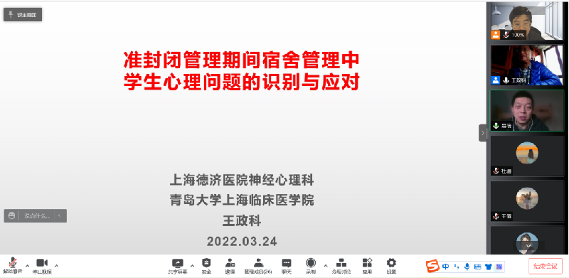 在校园准封闭式管理状态下,为提升学生心理健康教育工作水平,有效帮助在校学生调适心情,近日,学校心理健康教育与咨询中心邀请上海德济医院神经心理科王政科副主任医师,与我校全体辅导员、宿管员相聚云端,开展《准封闭管理期间宿舍管理中学生心理问题的识别与应对》专题培训。