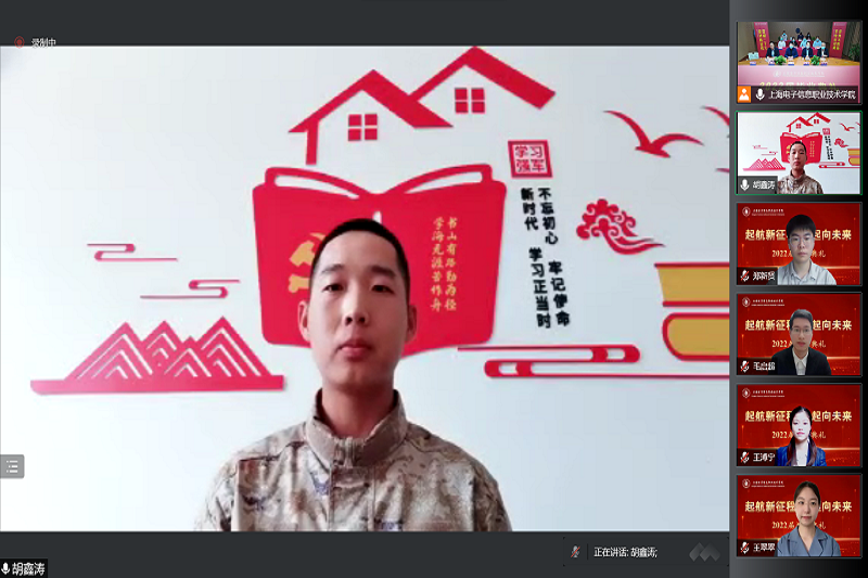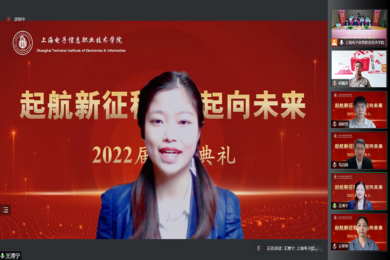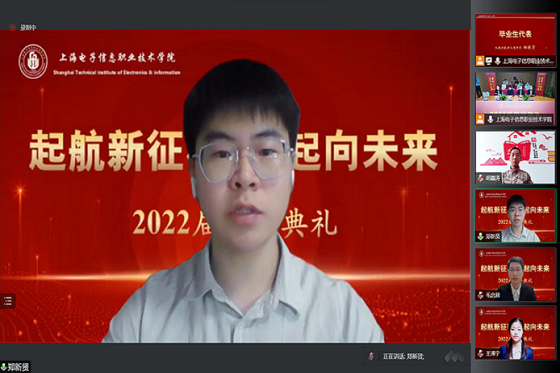 通过云端连线的方式,学校与目前就职于特斯拉(上海)有限公司的毛启超,学校第一届高职扩招优秀毕业生王翠翠,高本贯通班、毕业后继续攻读学士学位的王溥宁,在毕业季选择投身军营、保家卫国的胡鑫涛等四位毕业生,送上母校对毕业生们的关怀和祝贺。毕业生代表录制视频《一路有爱·感恩有你》,展现出毕业生们对全体教师三年来的谆谆教诲、对后勤工作人员的无尽付出、对同窗好友的温暖相伴最真诚的感谢。