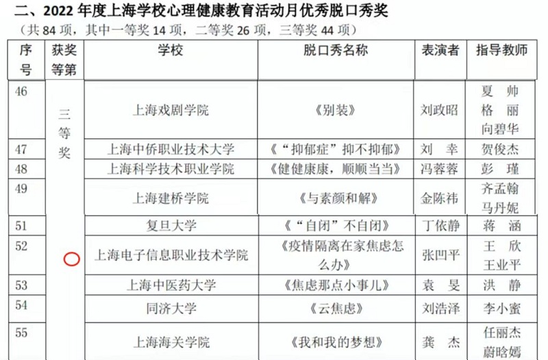 近日,由上海市教育委员会德育处指导、上海学生心理健康教育发展中心主办的2022年上海学校“我秀我健康 一起向未来”主题心理健康教育活动月评选结果揭晓。我校在本次活动月中表现突出,荣获“2022年度上海学校心理健康教育活动月优秀组织奖”。来自设计与艺术学院的张凹平同学凭借作品《疫情隔离在家焦虑怎么办?》荣获“2022年度上海学校心理健康教育活动月优秀脱口秀三等奖”。