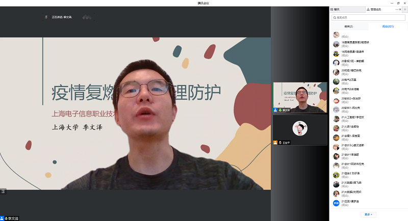 此次系列讲座自4月28日开始,持续到5月25日,主题涵盖心理防护、团体互助、身心调适、习惯养成等内容。讲座专家季文泽、陈洁、蔡日月、潘佳丽分别来自上海大学、上海城建职业学院、上海民航职业技术学院、上海商学院等院校。