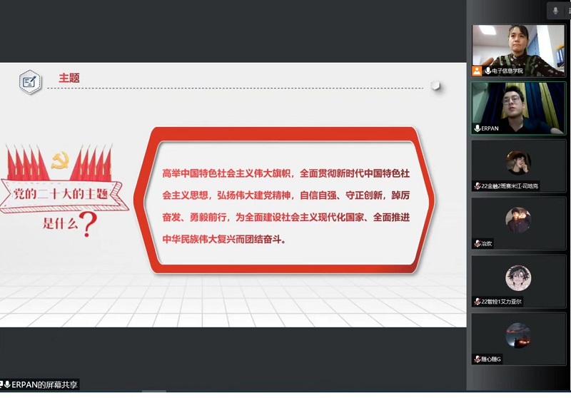 10月21日下午,由学工部组织的“领会二十大精神 扬帆起航追梦人”法治宣传教育活动在线上成功举办。学工部少数民族专职辅导员古丽巴哈尔、耶尔畔担任主讲,2020级、2021级、2022级少数民族学生代表参加了本次活动。