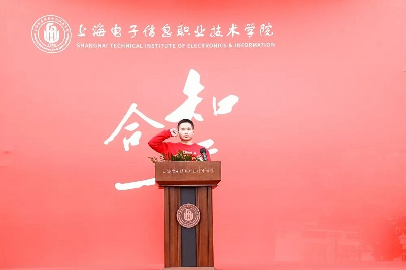 电子技术与工程学院卢克作为2022级新生代表发言。他说到:“当怀着忐忑、憧憬、梦想踏入学校,感受到了学校欣欣向荣、朝气蓬勃的气息。在疫情这个特殊的时期,学校各项工作的精细安排、井然有序,温暖地守护了每一位学生。”他号召同学们将喻理求真的行动实践于身,努力成为一名合格的新时代大国工匠。