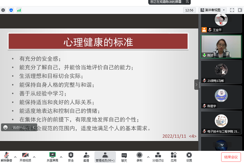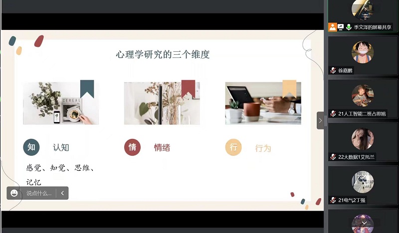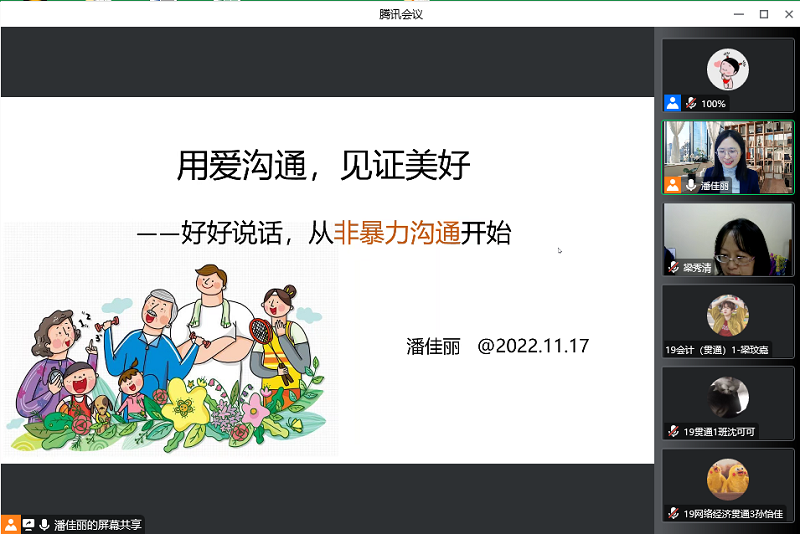 四位来自心理健康教育一线的专家将多年来宝贵的心理工作实践经验与大学生心理发展规律相结合,将理论讲解与案例分析相融合,肯定了心理委员在大学生心理健康教育工作中的重要地位和职责功能,激发了心理委员工作的动力和热情,也增长了心理委员知识储备和工作技能技巧。从心理异常的辨识,到危机干预的策略;从情绪反应的心理,到情绪调适的方法;从沟通对人际关系的影响,到暴力沟通模式如何应用;从心理委员的工作职责,到如何发挥重要作用;四场培训带领同学们从知识入手,到策略应用和能力提高,让每个参与培训的同学都有了满满的收获。