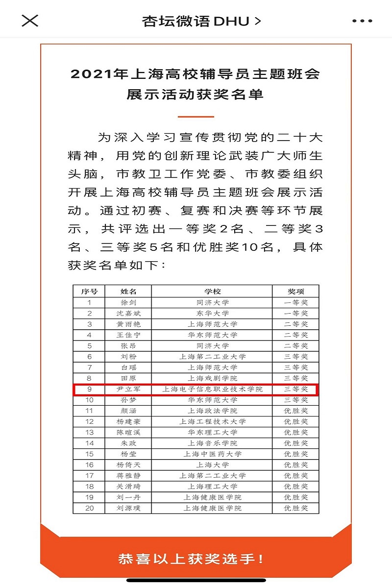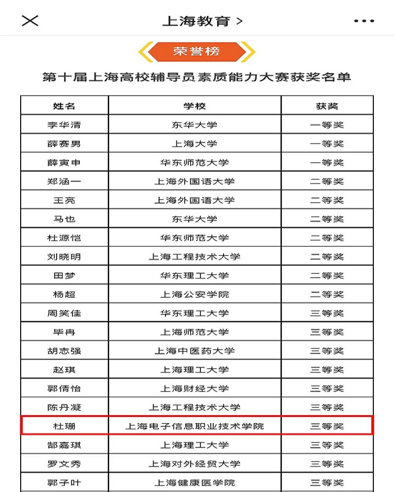 近日,由上海市教卫工作党委、市教委主办的第十届上海高校辅导员素质能力大赛、2021年上海高校辅导员主题班会展示活动,上海市职业教育德育工作联盟主办的上海市职业院校“青春心向党 奋进新时代”党的二十大精神主题宣讲展示活动结果陆续揭晓,我校专职辅导员杜珊、尹立军、张秀丽三位老师表现优异,取得了显著成绩,推动我校辅导员队伍建设再上新台阶。
