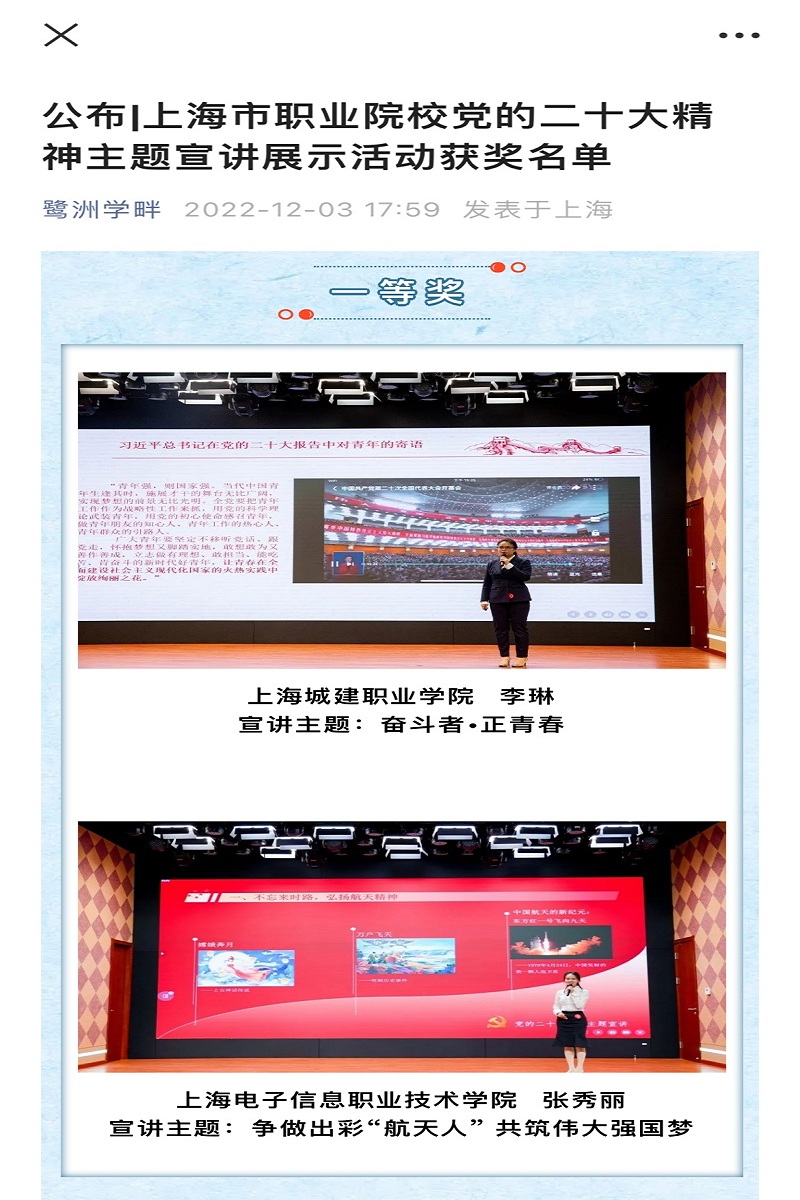 荣获上海市职业院校“青春心向党 奋进新征程”党的二十大精神主题宣讲展示活动一等奖