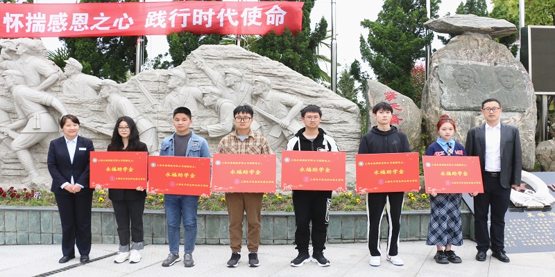 为深入推进“521大爱铸梦”发展型资助育人工程,进一步弘扬爱国精神和革命奋斗精神,增强学生家国情怀,4月14日下午,学校在上海人民志愿军纪念广场举行2021-2022学年永福奖助学金、徐渭岳奖学金颁发仪式,上海永福园陵有限公司董事长徐渭岳、党支部书记孙伯根、副总经理王雅萍、办公室主任徐冬,学校党委副书记、副院长张涛、学生处处长栾文飞、副处长吴奇峰出席仪式,学生处相关老师、受助学生代表和少数民族学生代表共计50余人参加。