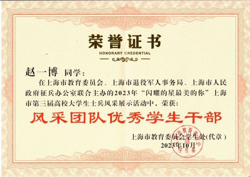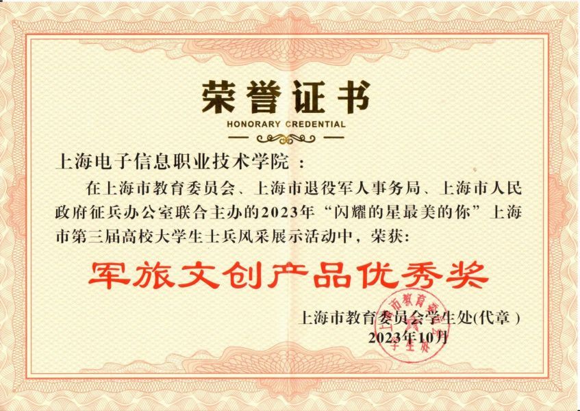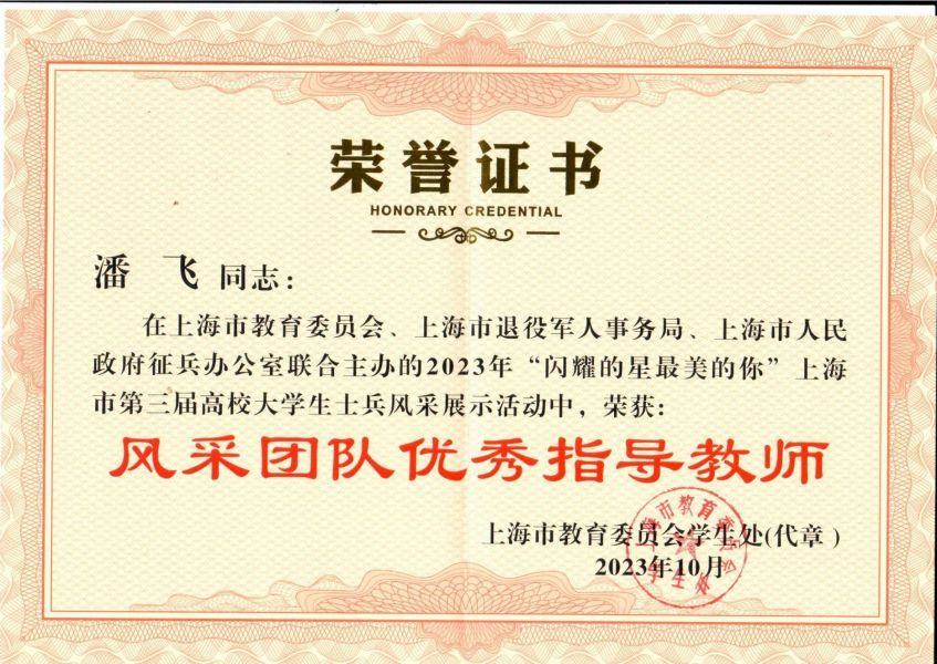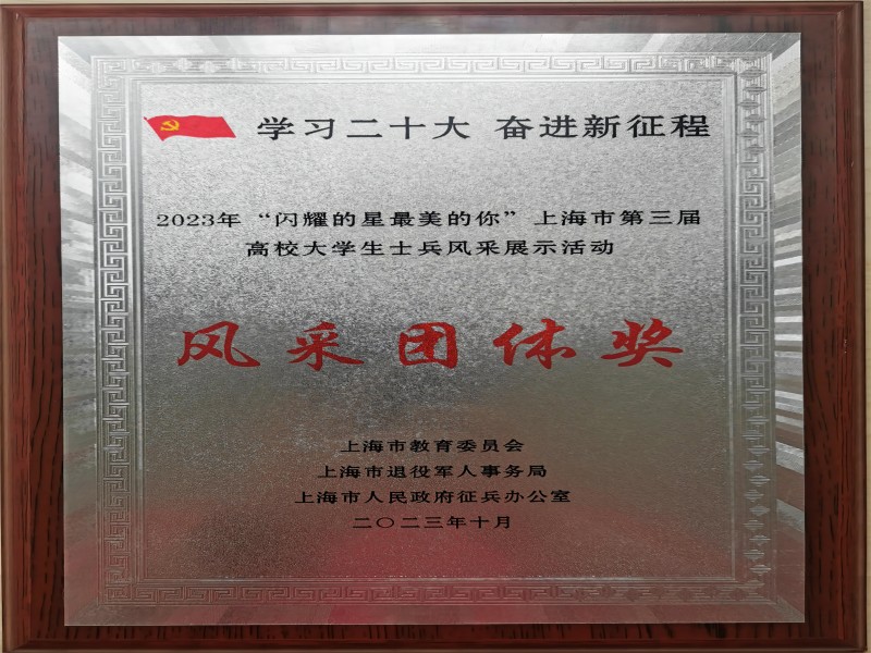 10月25日,由上海市教育委员会、上海市退役军人事务局、上海市人民政府征兵办公室主办的“闪耀的星 最美的你”上海市第三届大学生士兵风采展示活动颁奖典礼在东方绿洲举行。我校国防军事类学生组织“铸魂团”荣获“风采团队”奖,通信与信息工程学院赵一博同学荣获“风采团队优秀学生干部”,通信与信息工程学院潘婷婷代表学校提交的军旅文创产品“永不褪色帆布包”荣获“军旅文创产品优秀奖”,人民武装部潘飞老师荣获“风采团队优秀指导老师”。