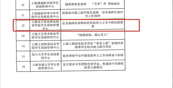 近日,上海市教育委员会发文公布第三届上海高校资助育人典型案例评审结果,全市高校范围内共评选出典型案例(单位)23项、典型案例(个人)94项,其中个人案例一等奖15项、二等奖20项、三等奖25项。我校4项案例成功入选,资助育人再结硕果!学校学生资助管理中心报送的《社会捐助在高职院校资助育人工作中的实践探索》被评选为第三届上海高校资助育人典型案例(单位);电子技术与工程学院《二级院校学生资助工作虚拟社区育人模式探索》(作者:张军丽、杨烨萍)荣获典型案例(个人)一等奖;设计与艺术学院《中华优秀传统文化赋能资助育人工作的实践途径探析》(作者:王静芳)、学生处《积极心理资本培育在高职院校资助育人工作中的作用与实践》(作者:毛箴琪)分别荣获典型案例(个人)二等奖。