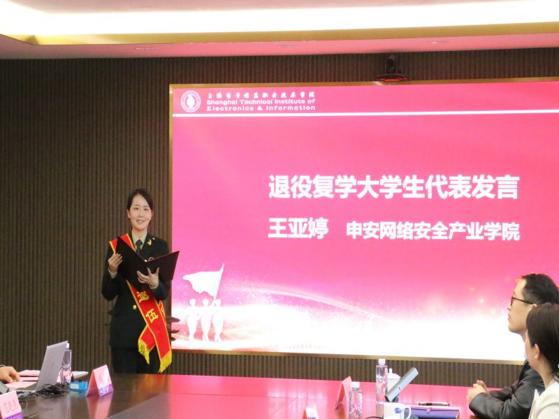 申安网络安全产业学院王亚婷同学代表退役复学大学生进行了发言,她分享了个人的军旅生涯,感谢学校老师对入伍学生的关怀和帮助,表示将退伍不褪色,积极参与学校军训、征兵宣传等工作,为学校发展贡献力量。