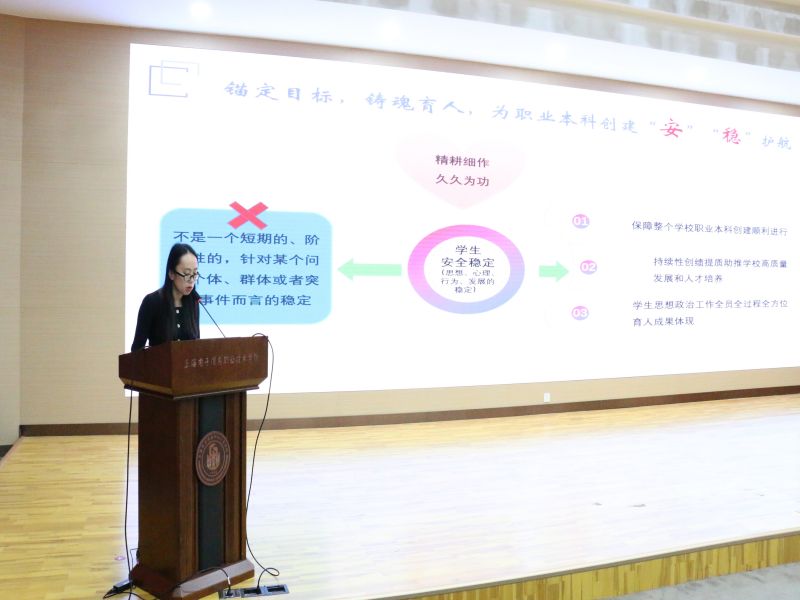 电子技术与工程学院党总支副书记、副院长杨烨萍以《锚定目标,铸魂育人:为职业本科创建“安”“稳”护航》为题作交流汇报。她表示,在“大思政”育人新格局中,学生安全稳定工作是学生思想政治工作全员全过程全方位育人成果体现,能够持续性创绩提质助推学校高质量发展和人才培养。