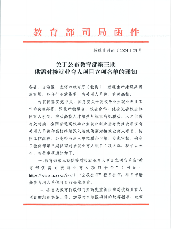 近日,教育部发布了《关于公布教育部第三期供需对接就业育人项目立项名单的通知》(教就业司函〔2024〕23号),上海高校达成项目立项347项,我校20个项目获得立项。其中定向人才培养培训项目5项、就业实习基地项目10项、重点领域校企合作项目1项、人力资源提升项目4项。