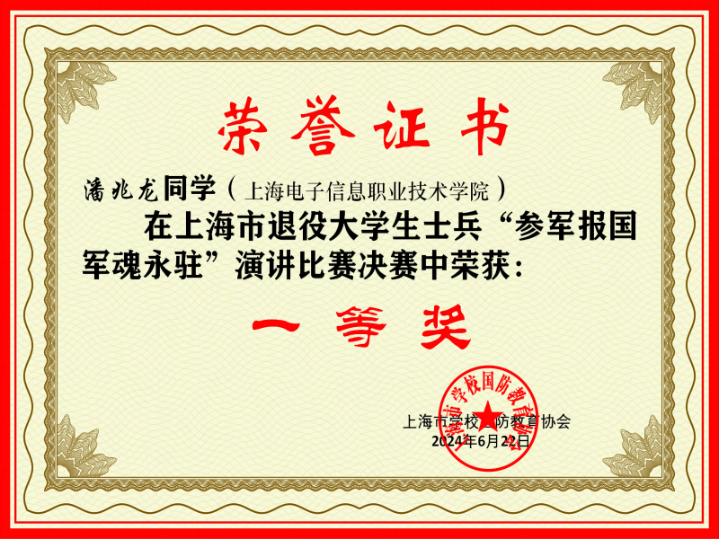 近日,由上海市教育委员会指导,上海市学校国防教育协会和上海退役军人学院联合举办的2024年上海市退役大学生士兵“参军报国军魂永驻”演讲比赛决赛在上海师范大学成功举行。经过层层选拔,本次决赛共有来自上海市11所高校的22名学生参加,我校退役大学生设计与艺术学院潘兆龙同学通过激烈角逐,以出色表现荣获一等奖。