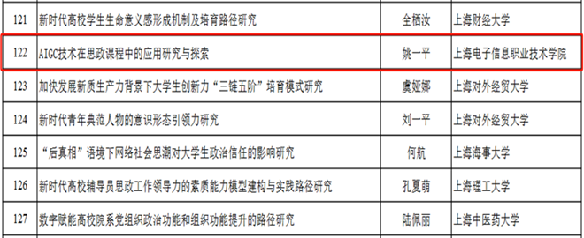 近日,教育部发布2024年度教育部人文社会科学研究一般项目评审结果,我校中德工程学院学管办主任姚一平申报的《AIGC技术在思政课程中的应用研究与探索》获批高校辅导员研究专项立项,实现我校学工队伍在教育部课题申报中“零”的突破。2024年度,教育部人文社会科学研究一般项目高校辅导员研究专项入选共202项,其中高职院校入选共31项,我校是上海唯一一所获得立项的高职院校。
