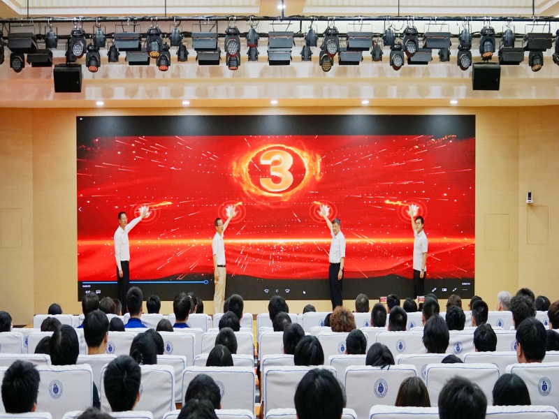 活动现场,童世平、傅建勤、张涛、徐汶强共同见证学校庆祝新中国成立75周年系列教育活动启动仪式。