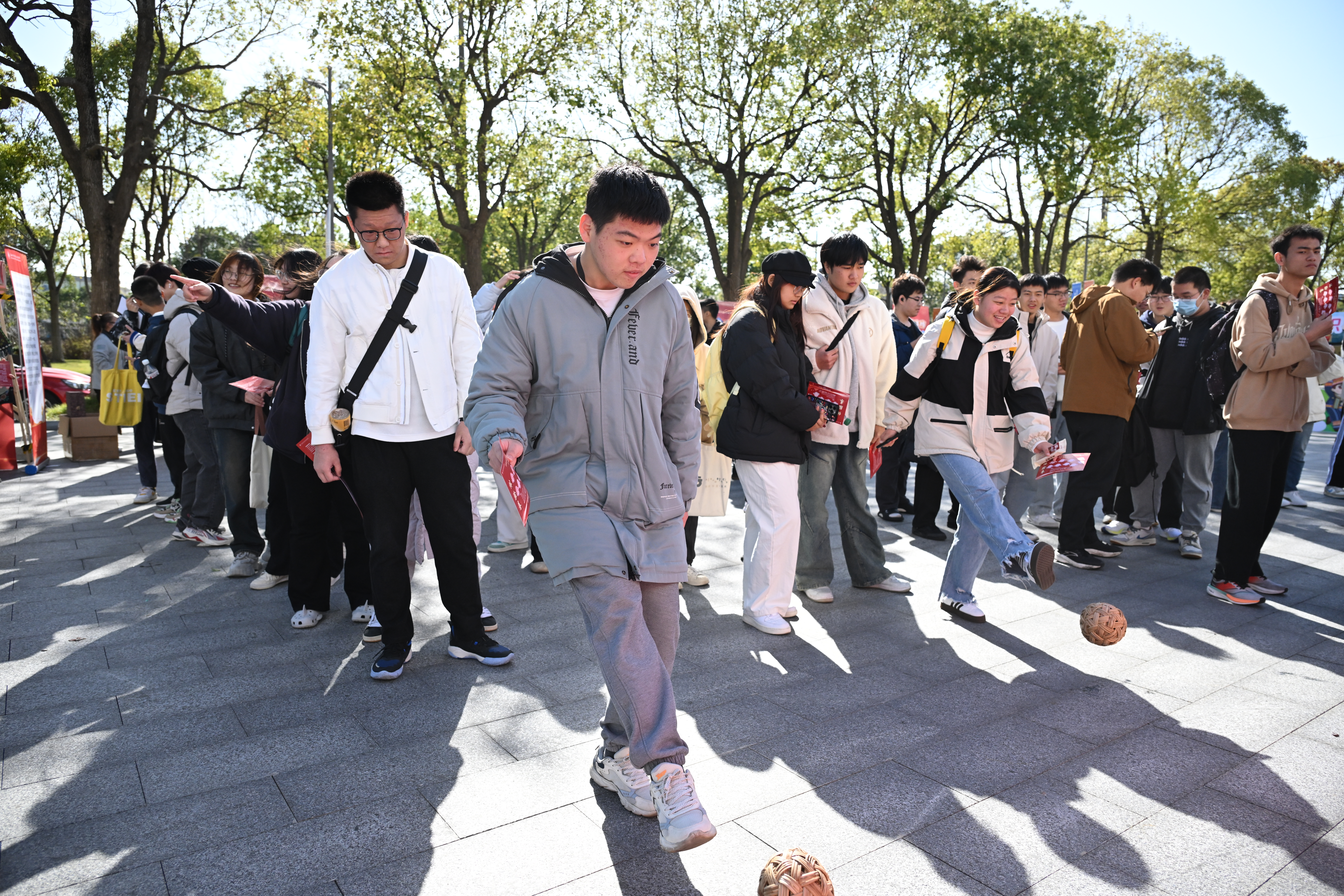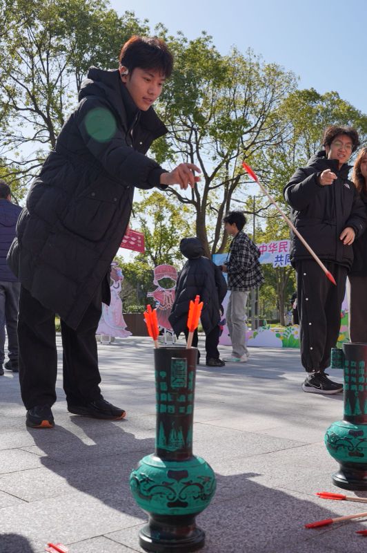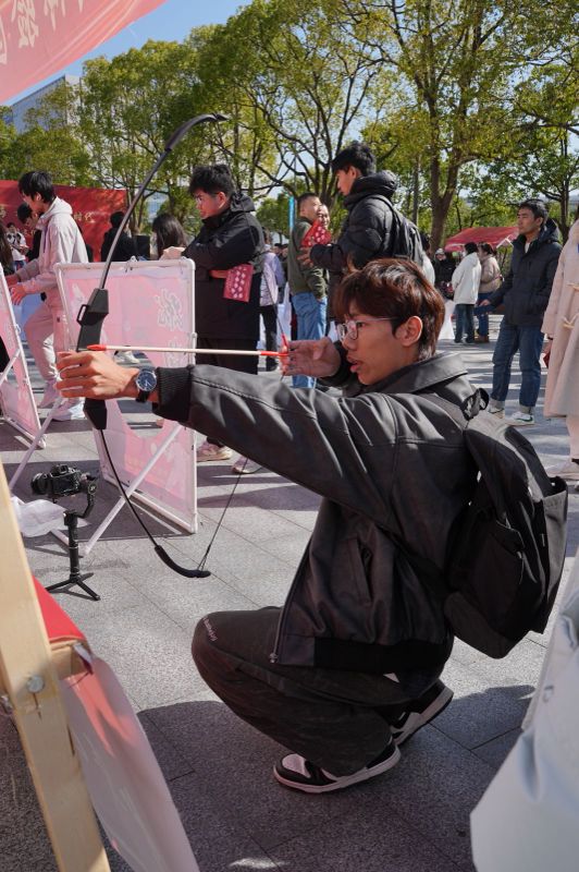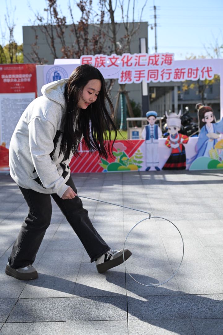 游戏体验区中,同学们滚动着面前的铁环,回忆起的都是儿时的槐花香;传统的射箭、投壶、蹴鞠等项目更是让同学们跃跃欲试。