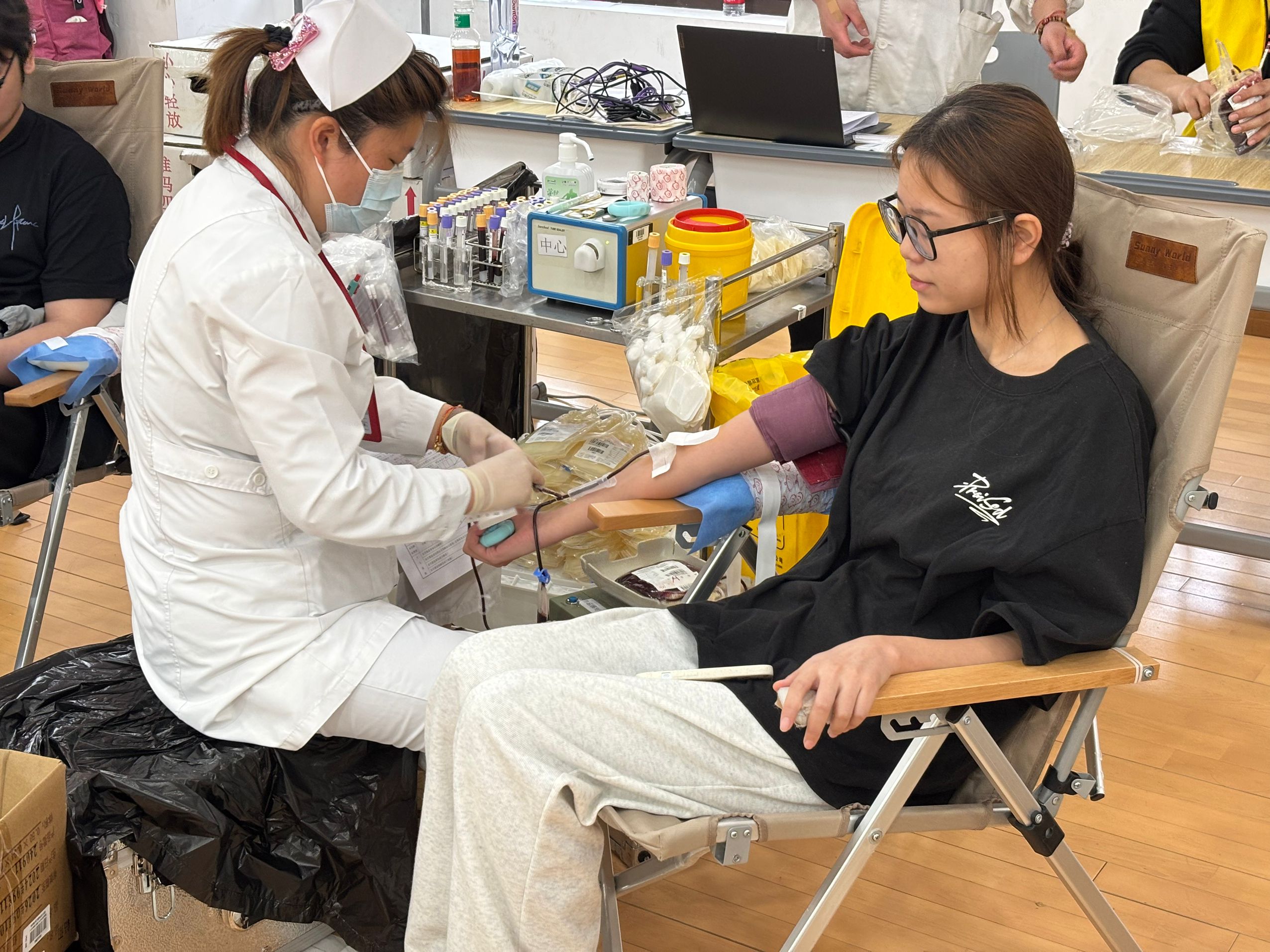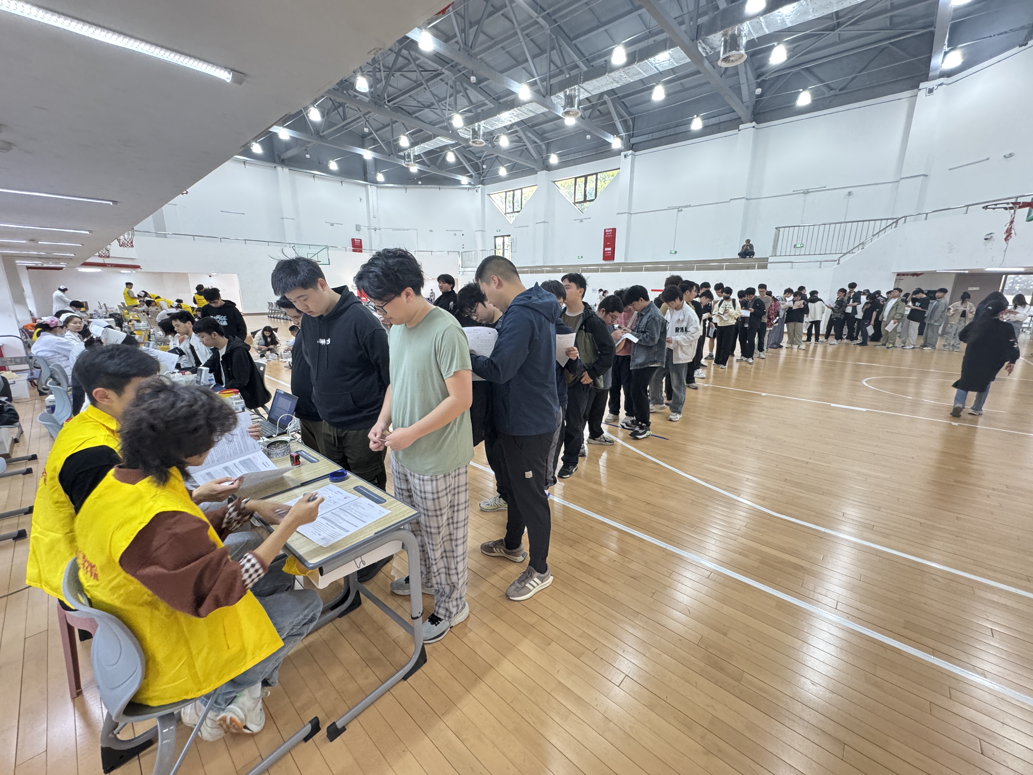 献血现场,前来献血的同学络绎不绝,在志愿者和上海市血液中心工作人员的引导下有条不紊地进行健康检查、血样采集、血型鉴定、血液采集,后勤保卫处联合学校食堂在献血现场特别供应红豆血糯米粥,并在用餐时段提供猪肝汤为参与献血师生补充营养,血液中心也为献血同学准备了丰富的纪念品。学生处和二级学院学生工作条线老师们认真组织,细心照顾献血同学,采血现场秩序良好。