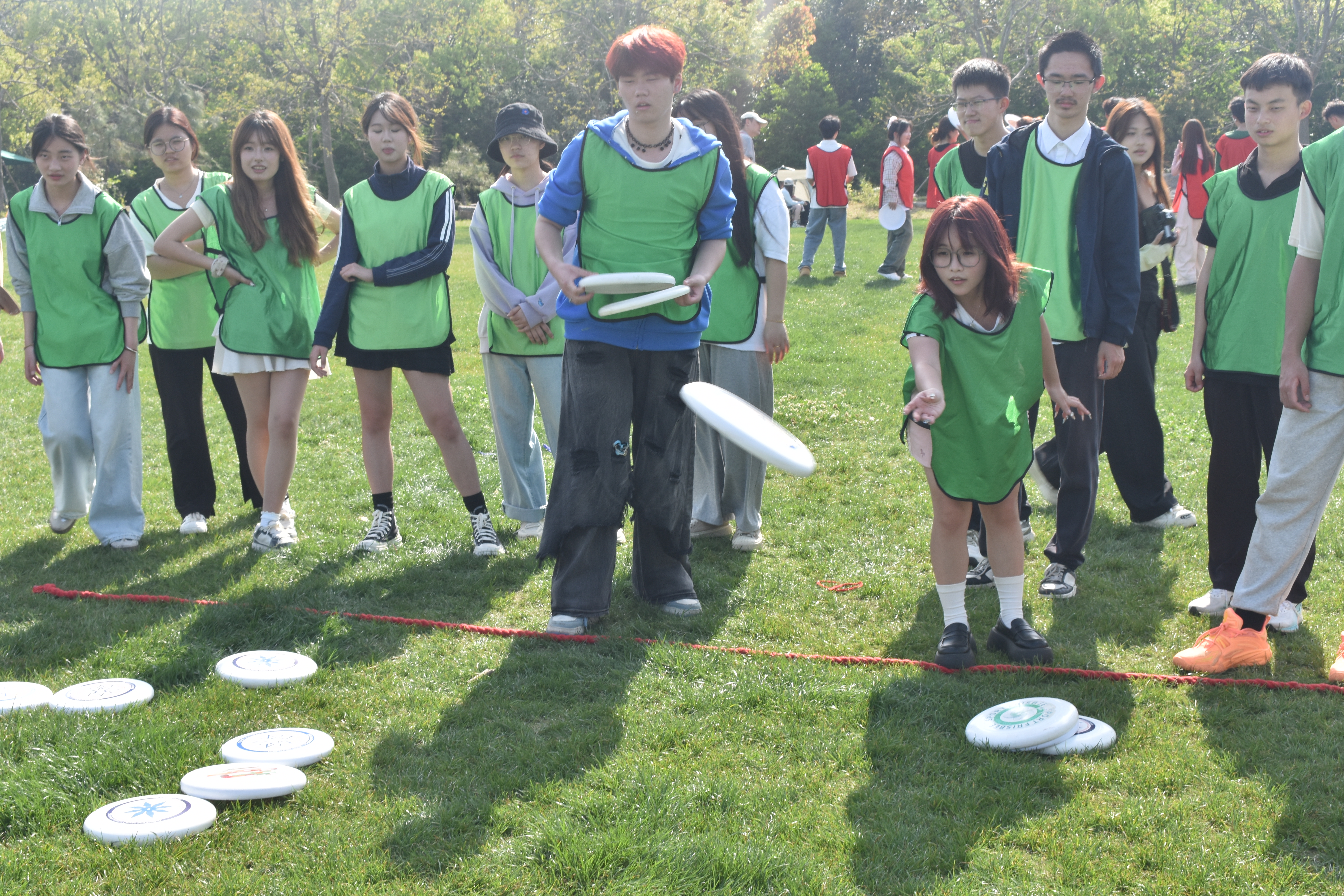 活动伊始,专业教练带领大家进行了充分的热身运动,确保每一位参与者在后续活动中能够沉浸式投入。随后,一系列精心设计的团队挑战项目依次展开。“飞盘精神”环节要求队员们密切配合,通过默契的协作完成指定任务,考验着大家的沟通与信任;“旱地冰壶”项目则让大家在统一的节奏中迈向目标,深刻体会到团队中每个人的重要性。活动现场气氛热烈,加油声、欢呼声此起彼伏,