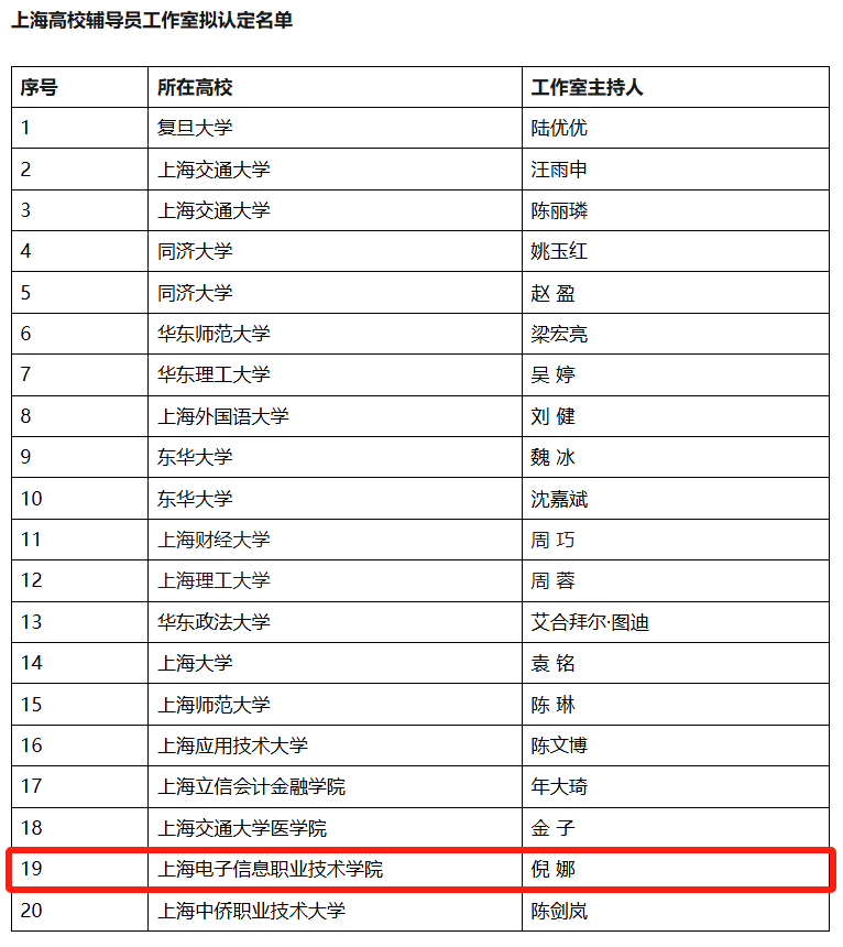 近日,上海市教育委员会公布上海高校辅导员工作室认定名单,我校机械与能源工程学院党总支副书记、副院长倪娜主持的“匠途融育”辅导员工作室成功入选,成为首批上海高校辅导员工作室。