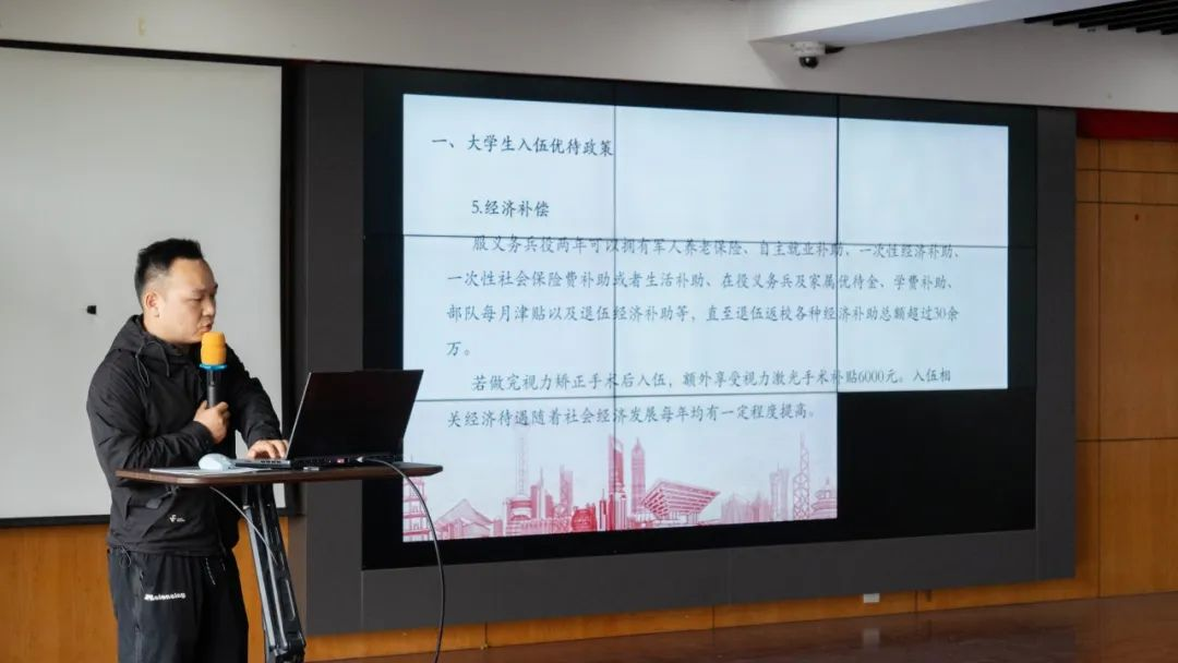 学校武装部潘飞老师从应征入伍的优待政策、应征入伍流程、应征报名条件以及学校近年来优秀应征学生案例等四个方面,详细解读了上海市大学生应征入伍政策,让同学们对参军入伍的相关政策有了全面、准确的了解,消除了大家的疑惑和顾虑。