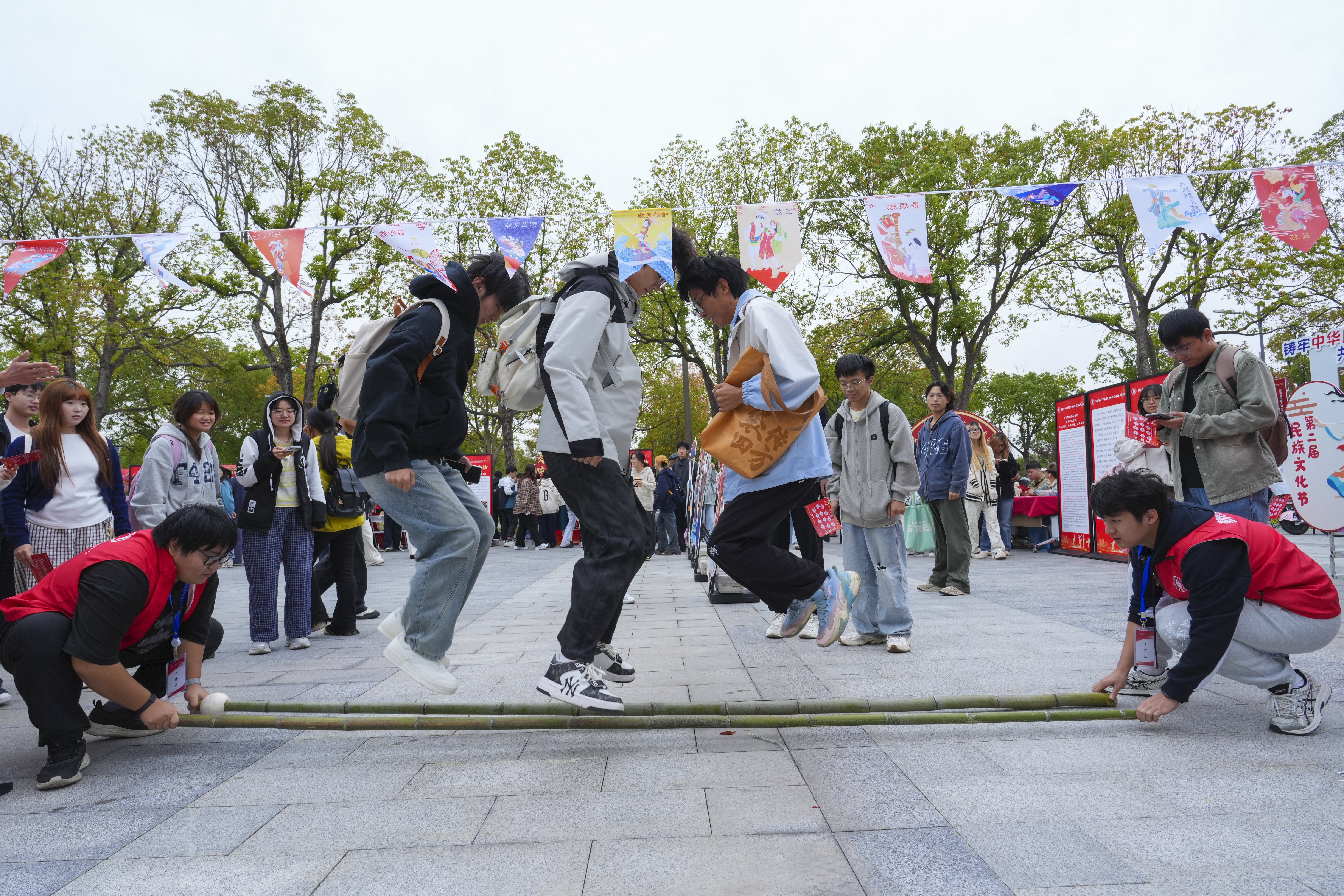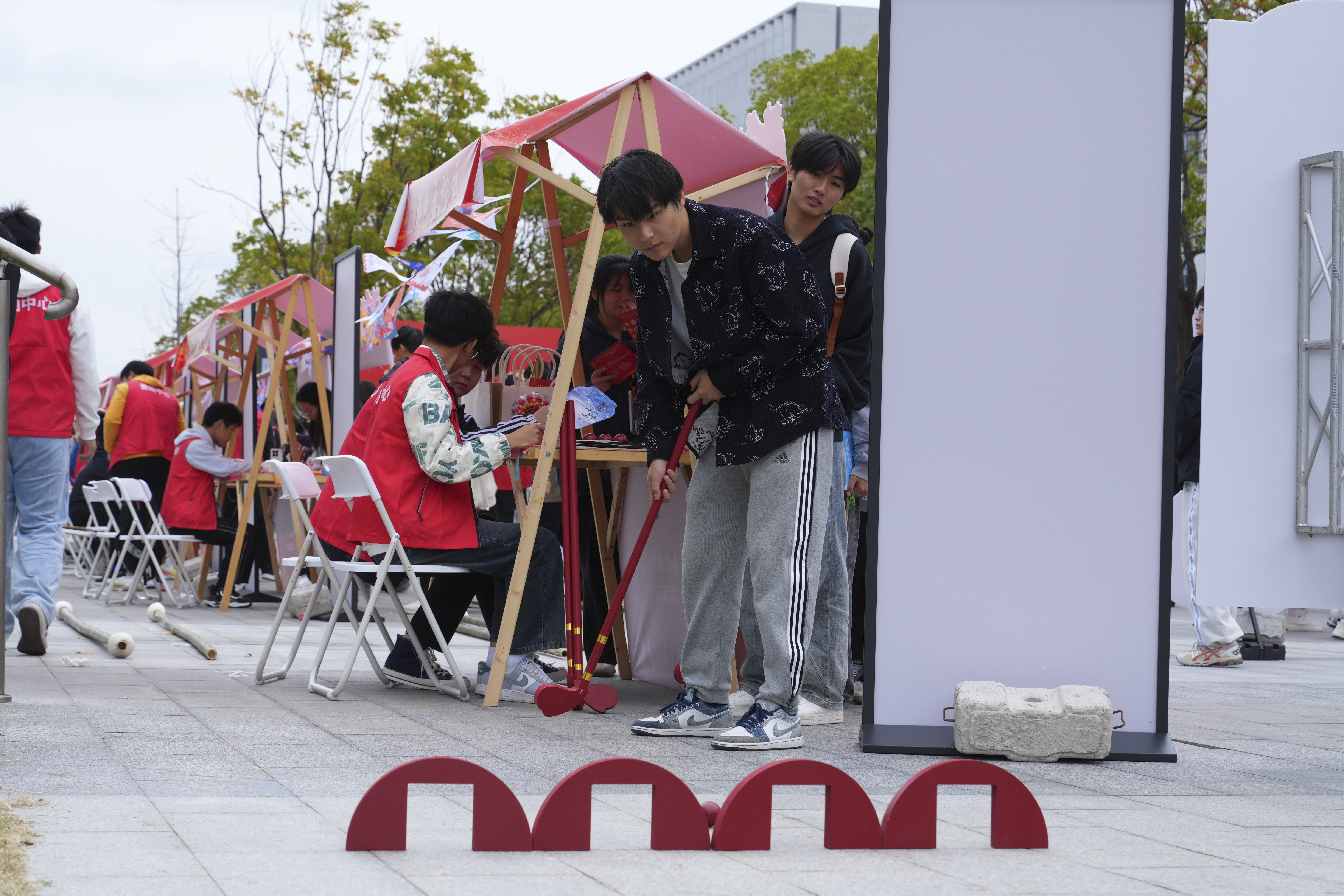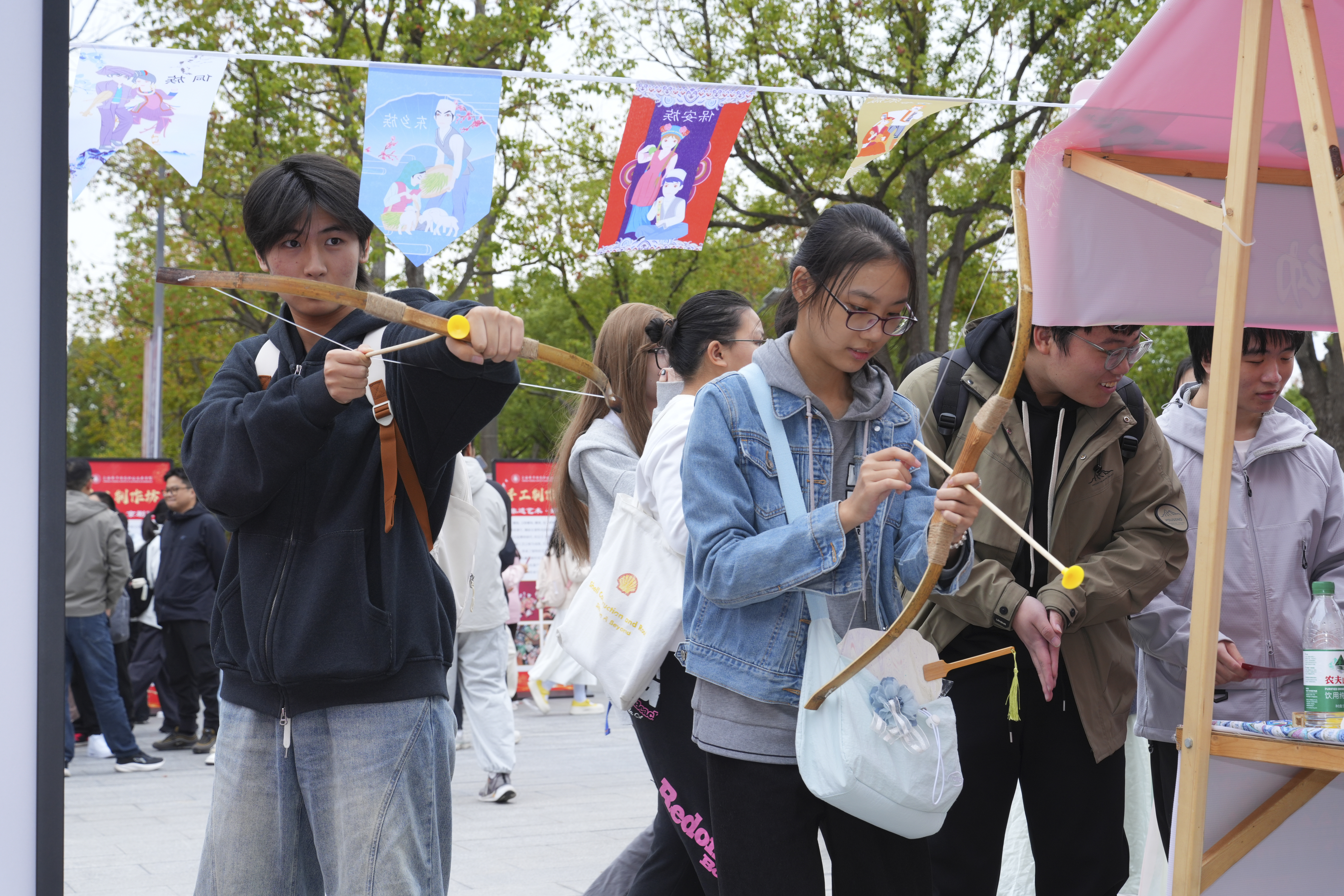 游戏体验区中,同学们抖起手中的空竹,清脆的声响里满是青春的欢笑;传统的锤丸、竹竿舞、射箭、投壶等项目,更是让同学们热情高涨、争相体验。