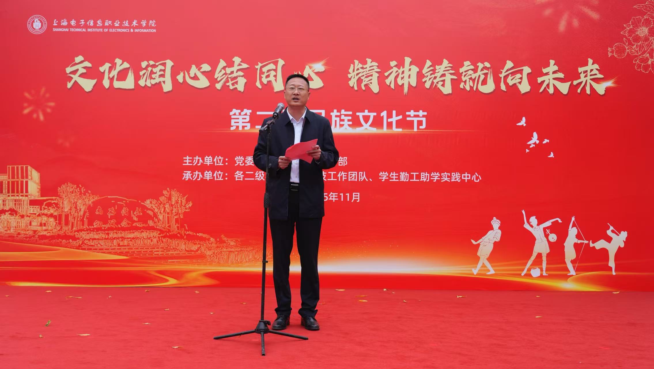 张涛致辞。他指出,作为培养新时代青年的重要阵地,高校肩负着传承中华优秀传统文化、铸牢中华民族共同体意识的重要使命。民族文化节的举办,正是践行这一使命的生动载体,能够有效促进各民族师生相知相交、同心同行。他强调,我们要以本次活动为契机,主动走进各民族的文化世界,用心感受其中的智慧与温度,在交流中消除隔阂、在理解中增进认同,让“各民族像石榴籽一样紧紧抱在一起”的理念深深扎根心中。希望师生能够成为民族文化的守护者与传播者,将民族文化中的优秀元素与时代精神相结合,用青春的创意为民族文化注入新的活力,让中华优秀传统文化在新时代绽放出更加耀眼的光芒。