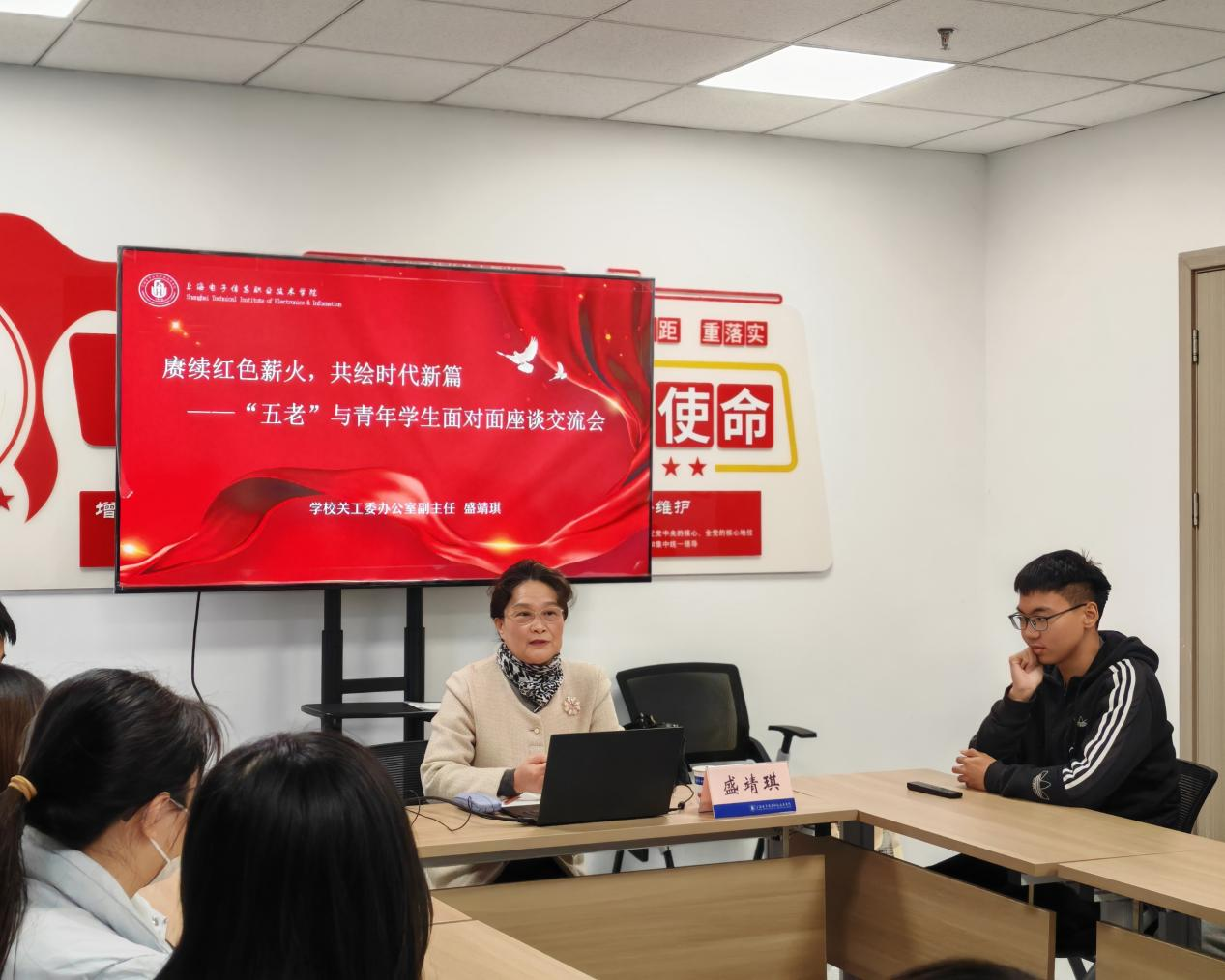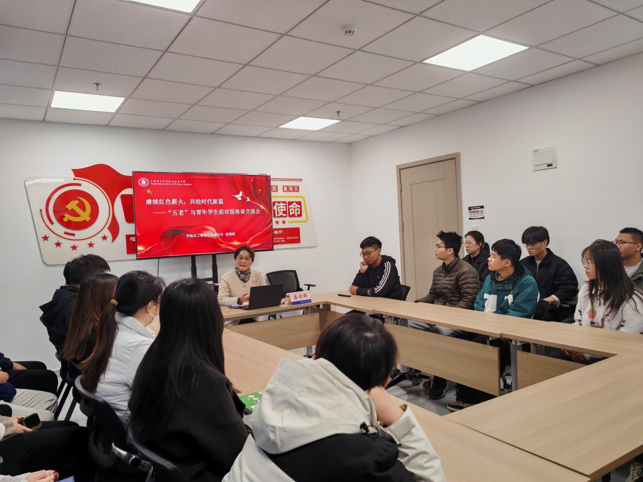 为深入学习贯彻习近平新时代中国特色社会主义思想,充分发挥“五老”独特优势,赋能青年学子成长成才,11月21日下午,学校关工委在“一站式”学生社区开展了一场以“赓续红色薪火,共绘时代新篇”为主题的“五老”与青年学生面对面座谈交流会。学校关工委办公室副主任盛靖琪作为主讲嘉宾,与来自各学院的入党积极分子、优秀学生代表围坐一堂,共话理想信念,畅谈时代担当,现场气氛温馨而热烈。